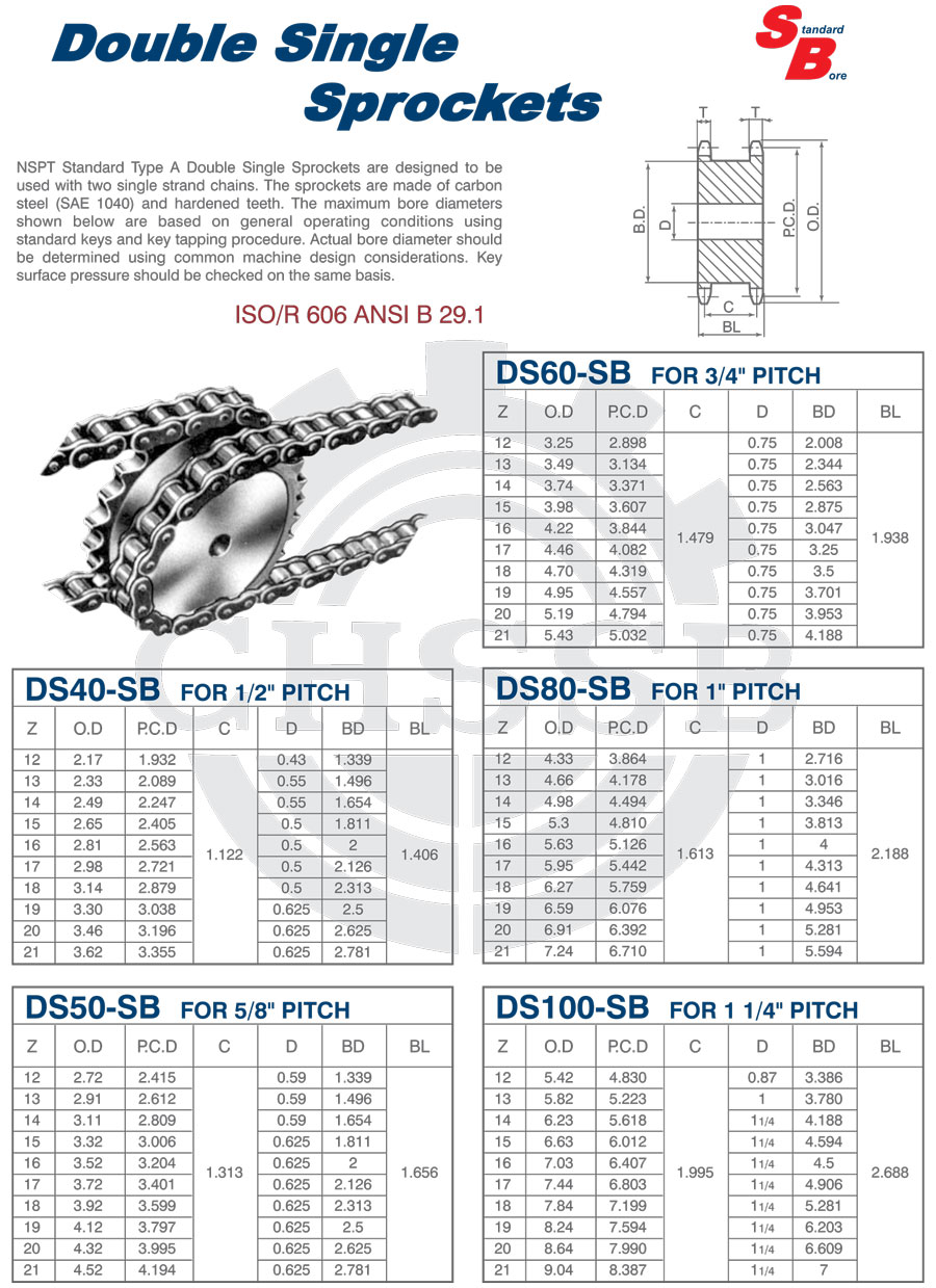 Range of product: ANSI:(DS-40SB/DS50-SB/DS60-SB/DS80-SB/DS100-SB) Inch size product (Apply to ANSI market) Stock Bore Double Single Sprockets